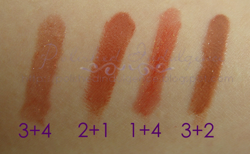 Personally, I think some of the names are misnomers. Mauve Berry has nothing mauve or berry in it at all. It's a nice warm nude shade that leans a bit orange. Plum Shimmer is more of a sheer Red Hot with shimmer.